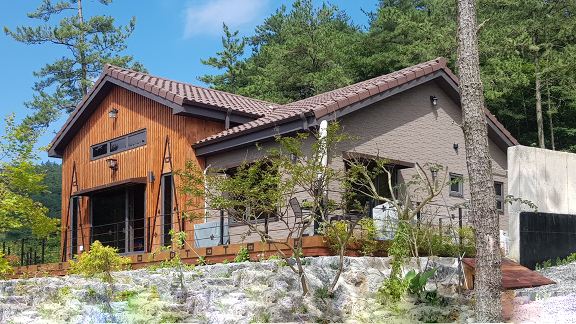 외장은 세라믹 사이딩으로 편리성을 높이고, 적삼목으로 포인트를 주어 자연과 어우러지도록 했습니다.
