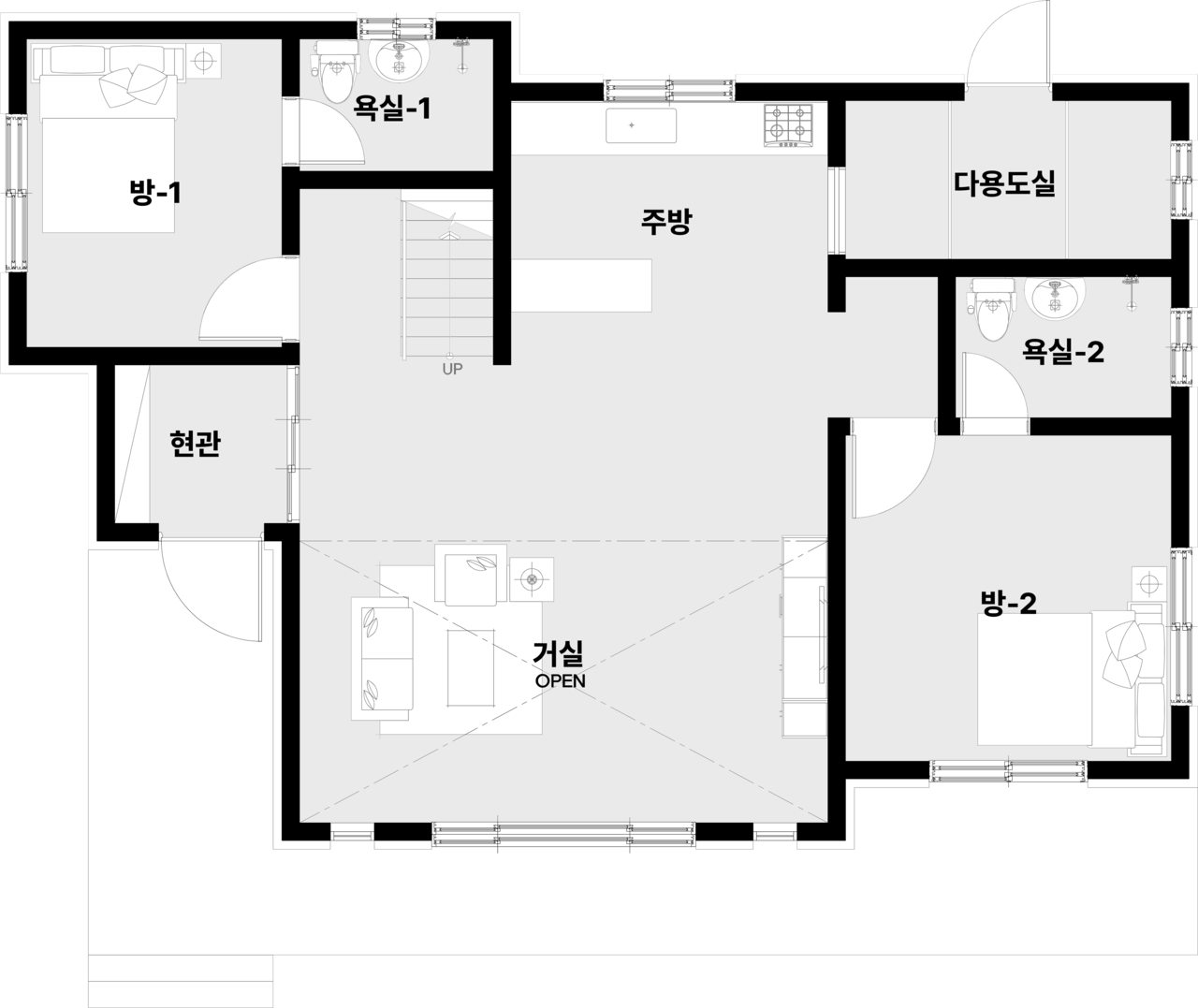 현관, 거실, 주방, 다용도실| 방 2, 화장실2, 다락