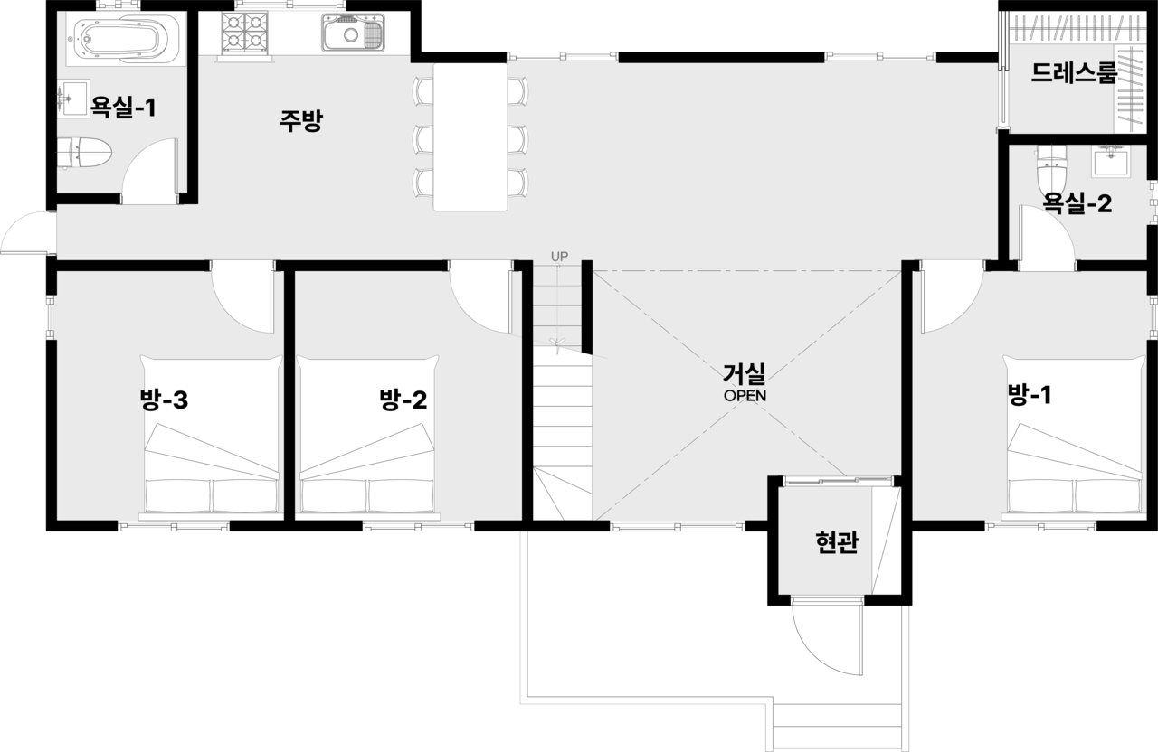 현관, 거실, 주방| 방 3, 화장실2, 드레스룸, 다락