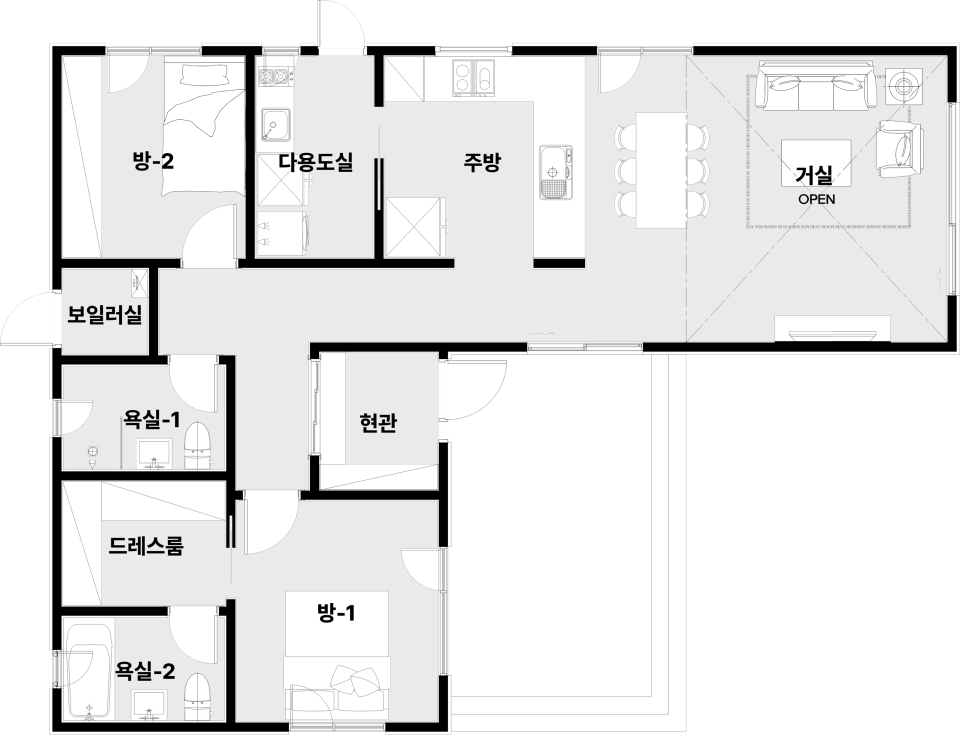 현관, 거실, 주방, 다용도실| 방 2, 화장실 2, 보일러실, 포치