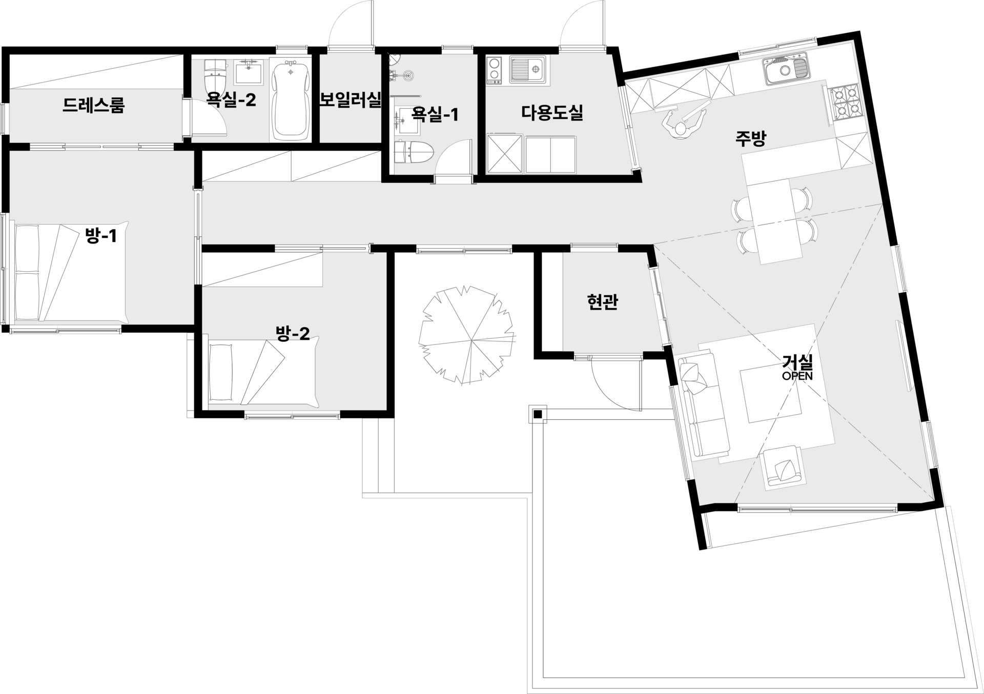 거실 매스를 비스듬하게 배치해 독특한 공간감을 자아냅니다.
