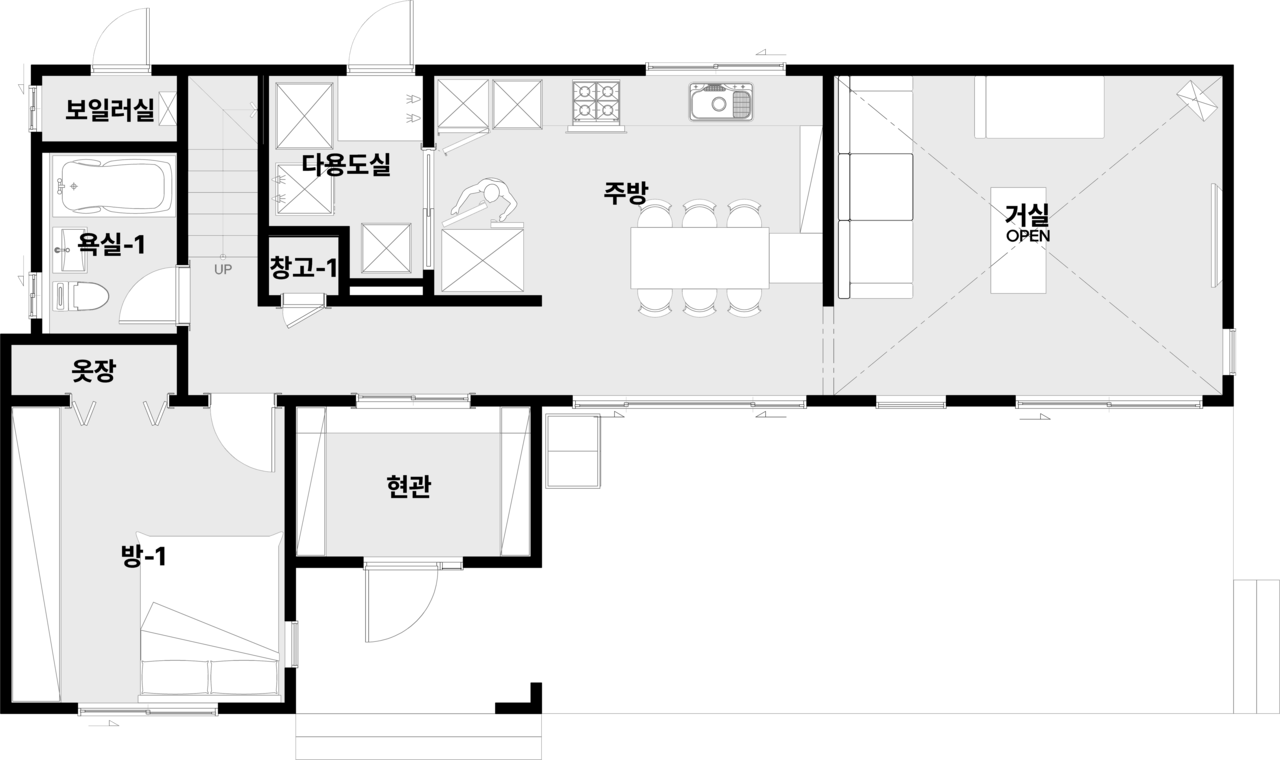 전면에 방을 배치해 햇빛을 받을 수 있도록 배치된 설계입니다.