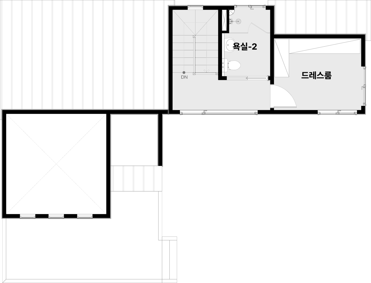 좌측 거실은 단층 오픈천정이고 우측 매스만 2층 구성인 설계입니다.