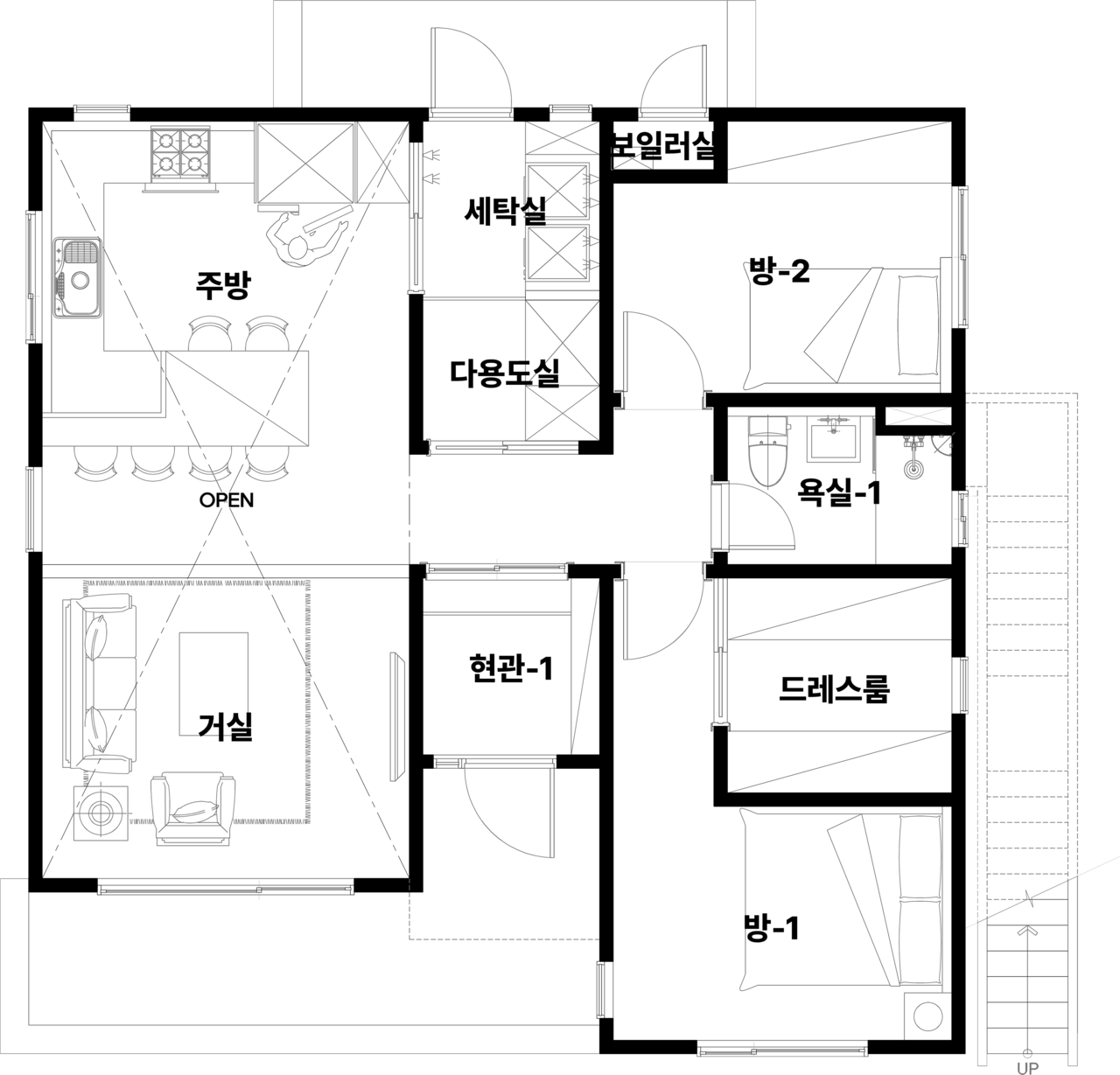 현관 2, 거실 2, 주방 2, 다용도실| 방 3, 화장실2, 드레스룸, 세탁실, 보일러실