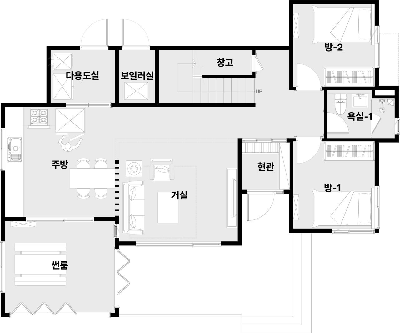 현관, 거실, 주방, 다용도실| 방 3, 화장실2, 드레스룸, 썬룸, 창고, 보일러실