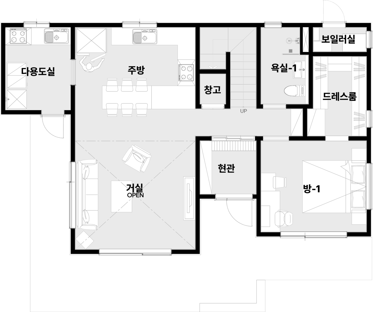 전면의 마당을 바라보는 형태로, 거실을 오픈으로 뚫어 2층과 연결되도록 한 설계안입니다.