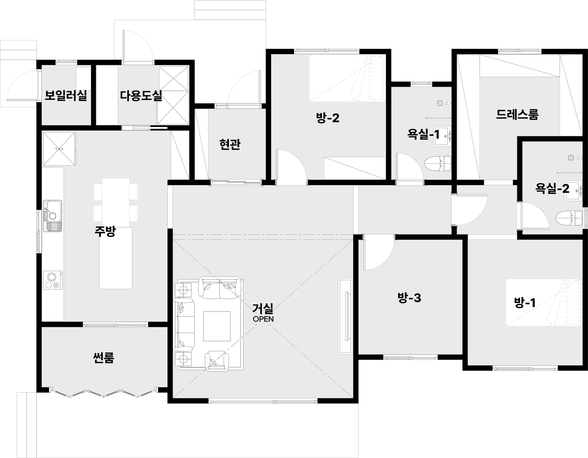현관, 거실, 주방, 다용도실| 방 3, 화장실 2, 보일러실, 드레스룸, 썬룸