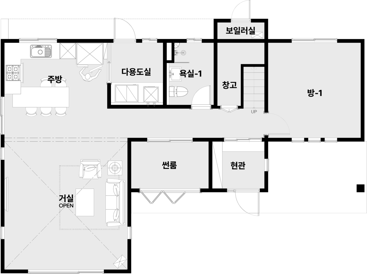 현관, 거실, 주방, 다용도실| 방 2, 화장실2, 썬룸, 가족실, 다락, 드레스룸, 창고, 보일러실