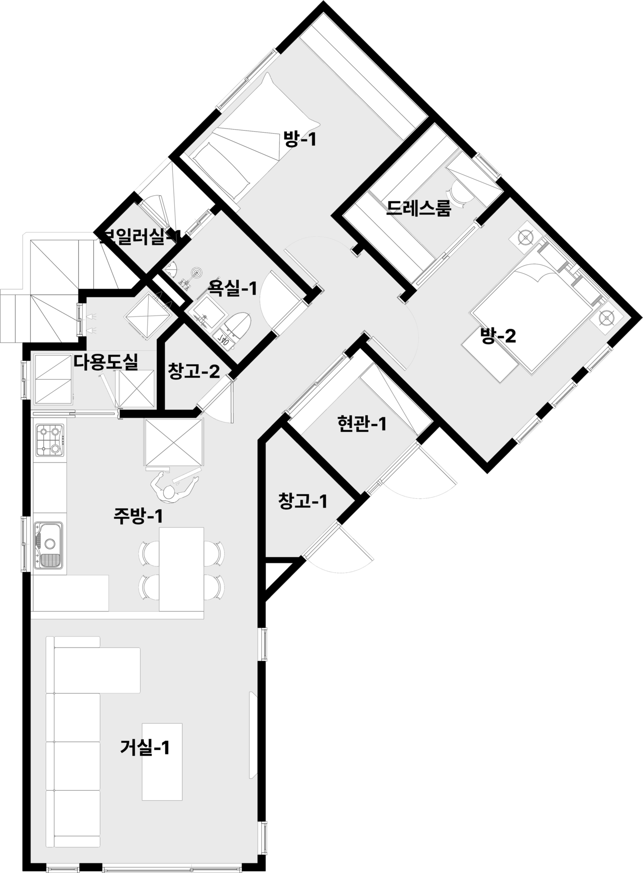 현관 3, 거실 3, 주방 3, 다용도실| 방 4, 화장실3, 드레스룸, 창고 2, 보일러실 3