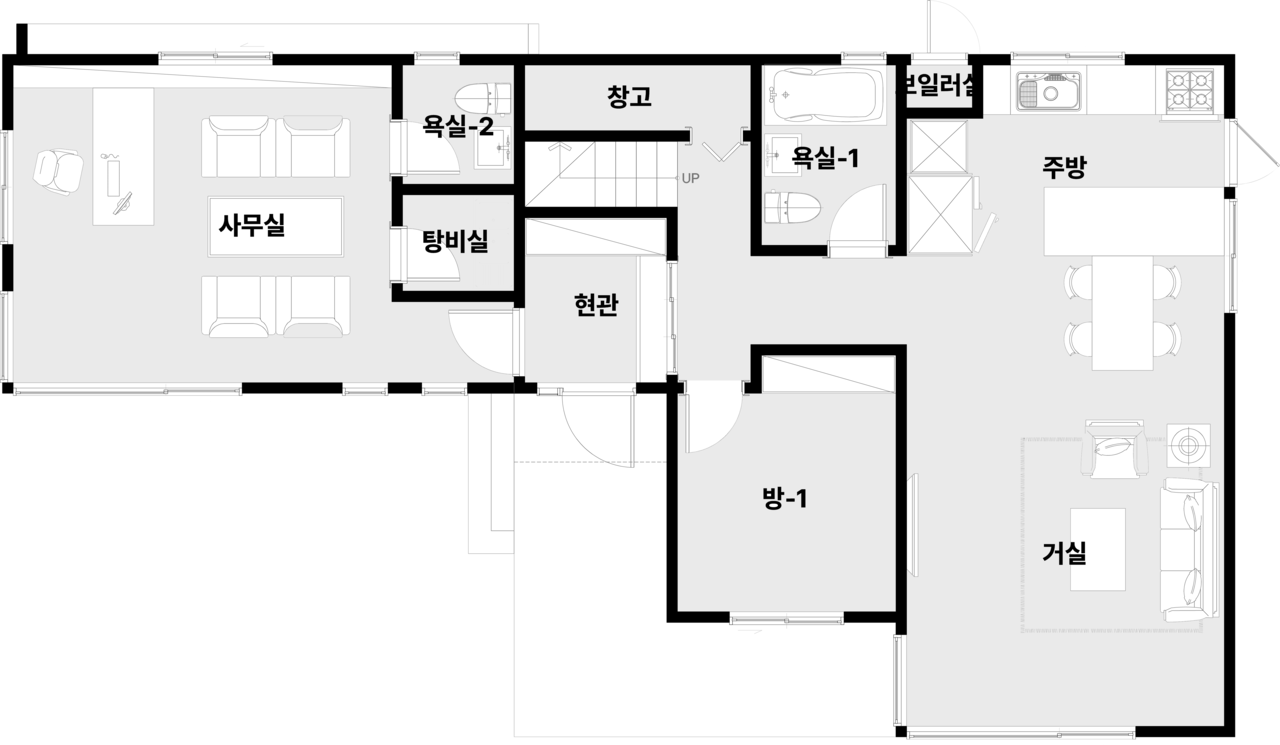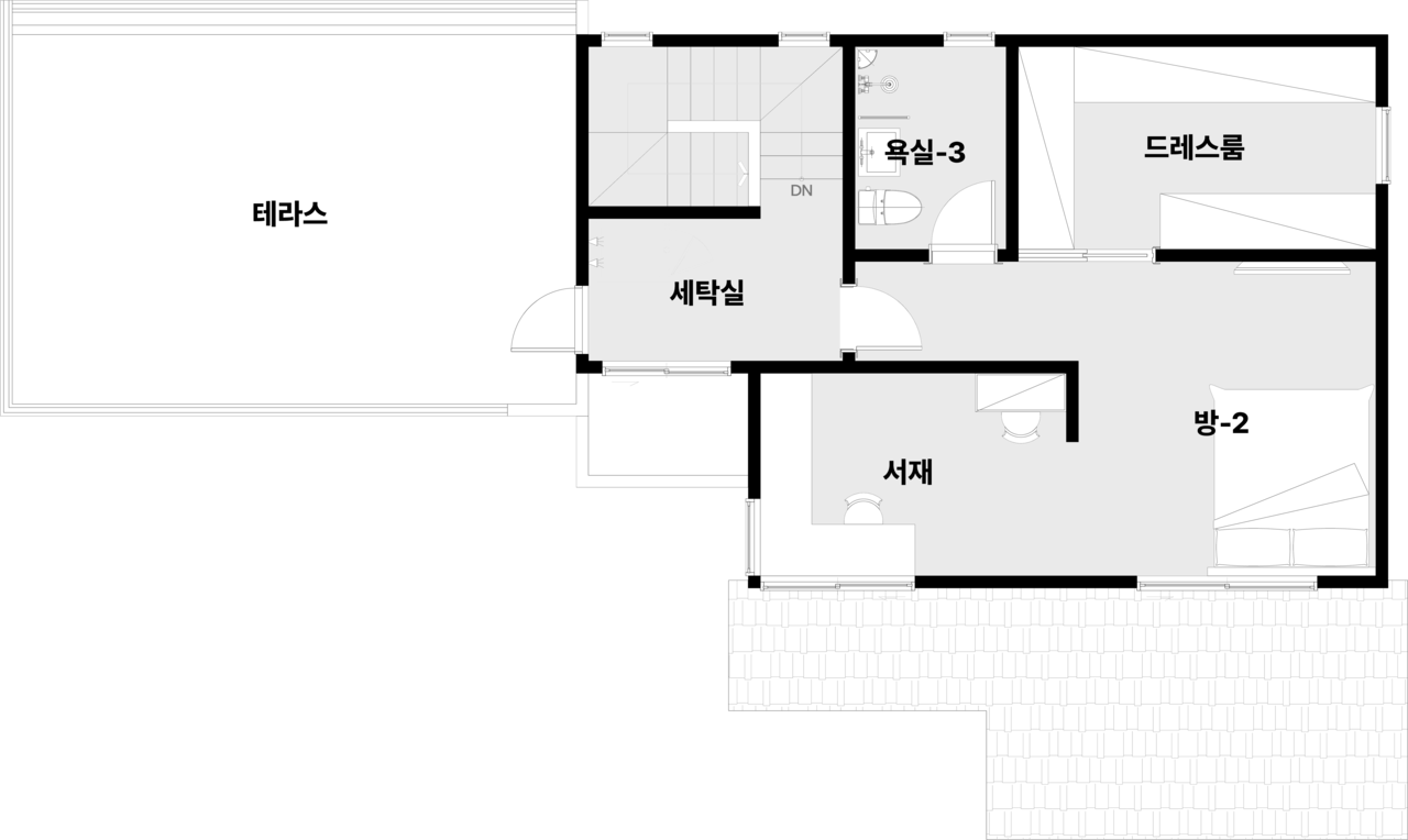 현관, 거실, 주방, 다용도실| 방 2, 화장실 3, 사무실, 탕비실, 창고, 드레스룸, 서재, 테라스
