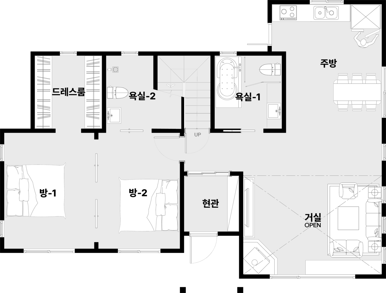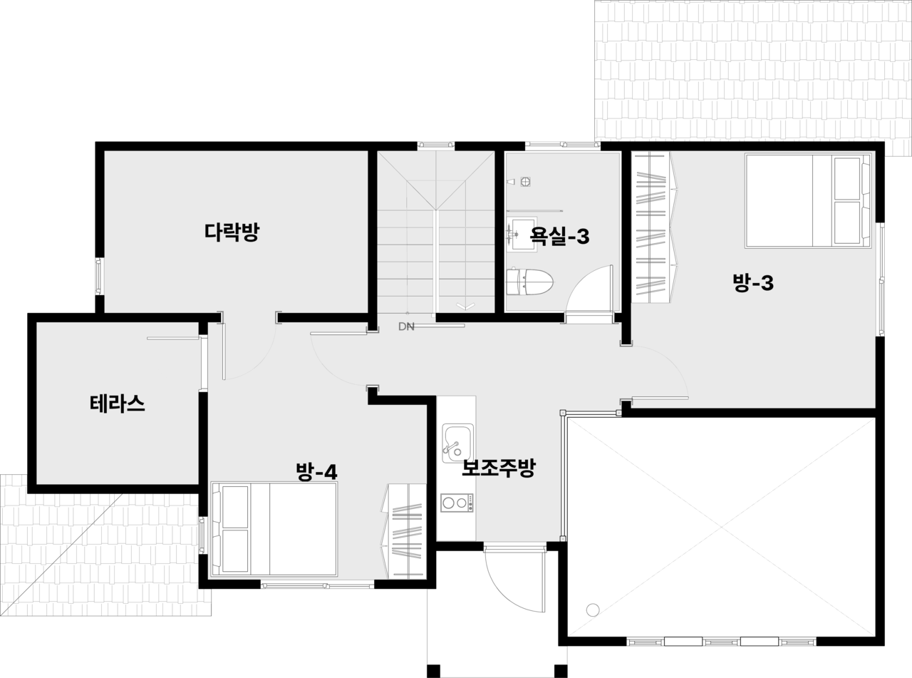 1층에 2개의 방이 가벽으로 분리된 형태로, 자녀들이 같이 사용할 수 있도록 구성한 설계입니다.