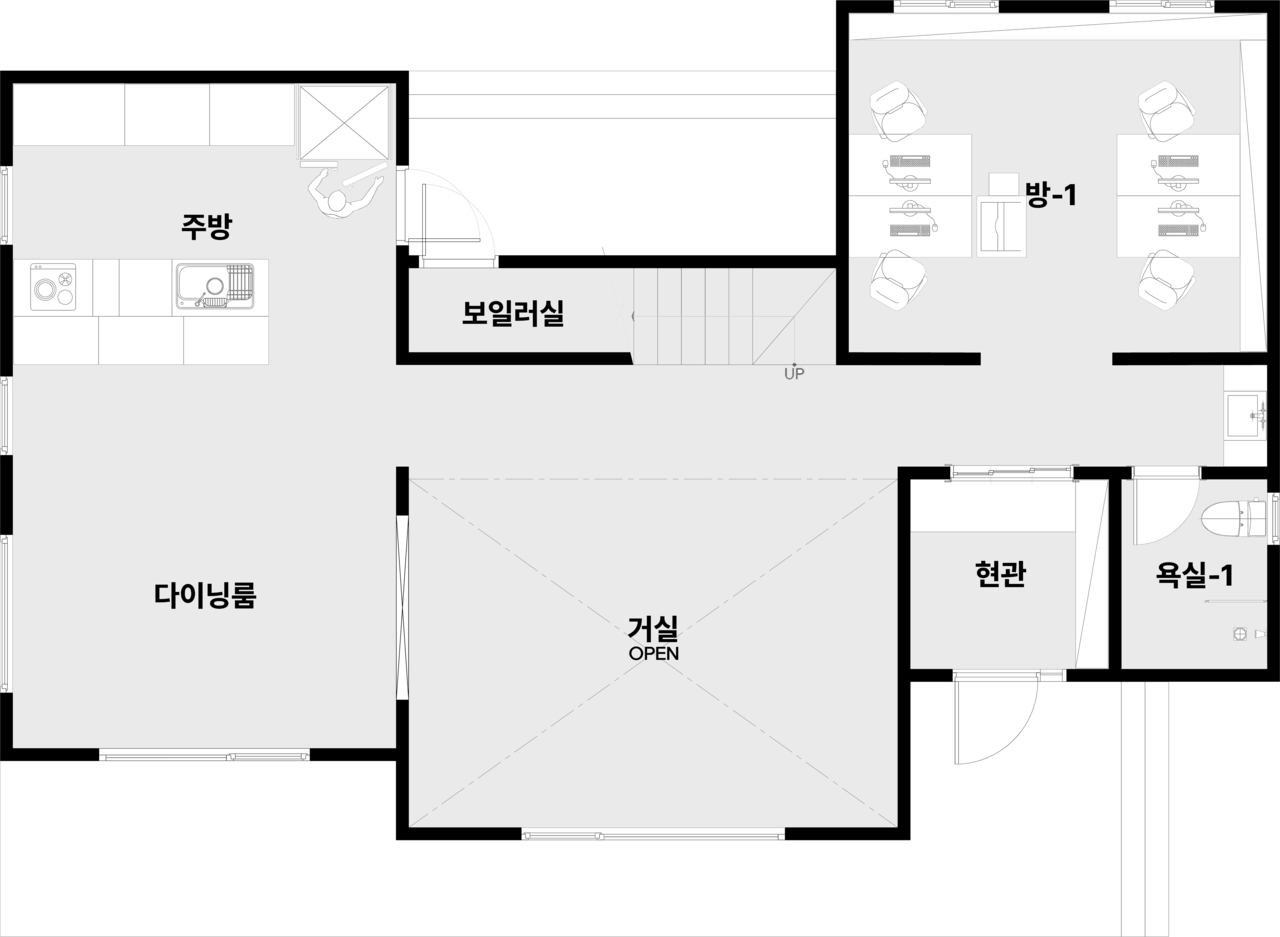 1층 현관 앞을 사무실로 이용하고, 2층에 대표실과 회의실을 배치하였습니다.