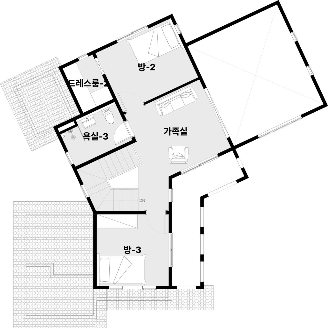 방 3, 욕실 3, 드레스룸 2의 알찬 구성의 설계입니다.
