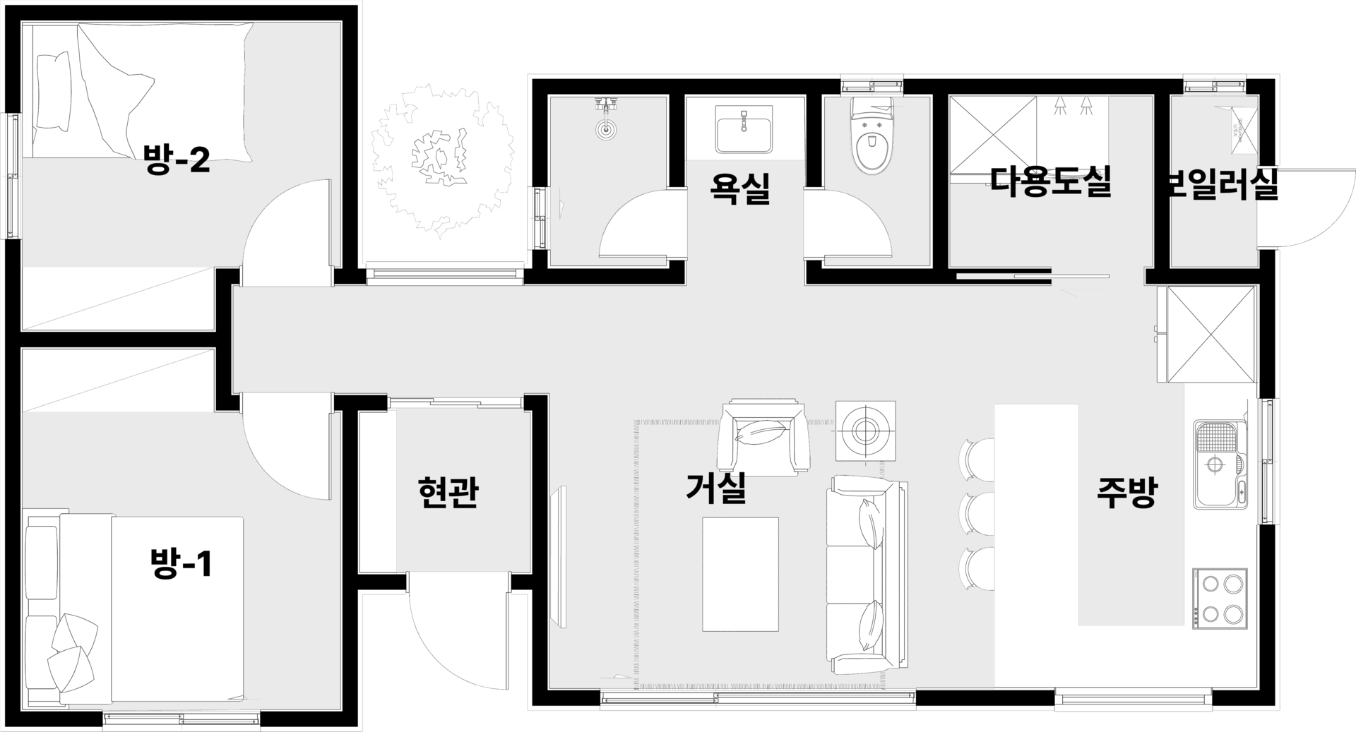 현관, 거실, 주방, 다용도실| 방 2, 화장실 1, 보일러실