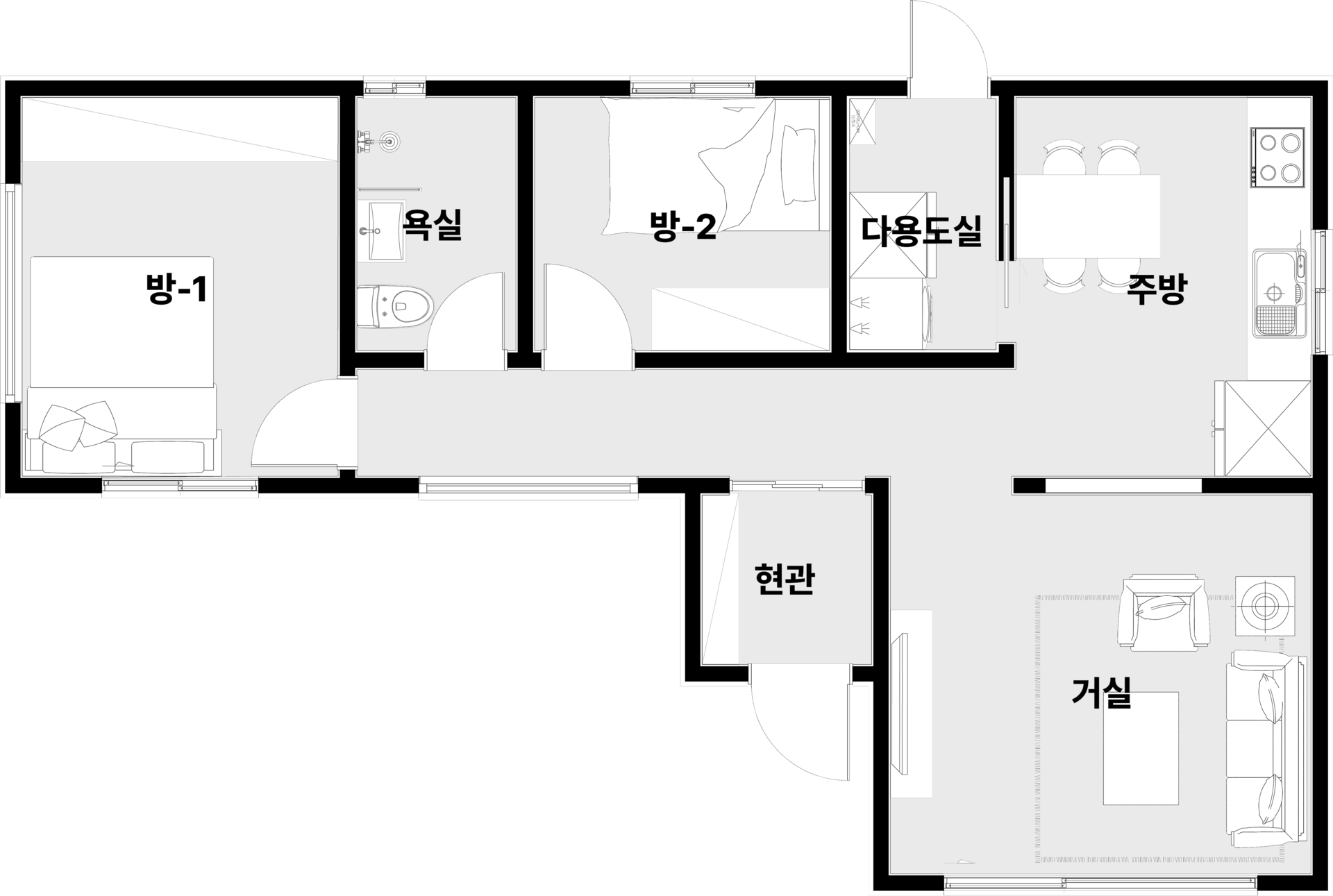현관, 거실, 주방, 다용도실| 방 2, 화장실 1
