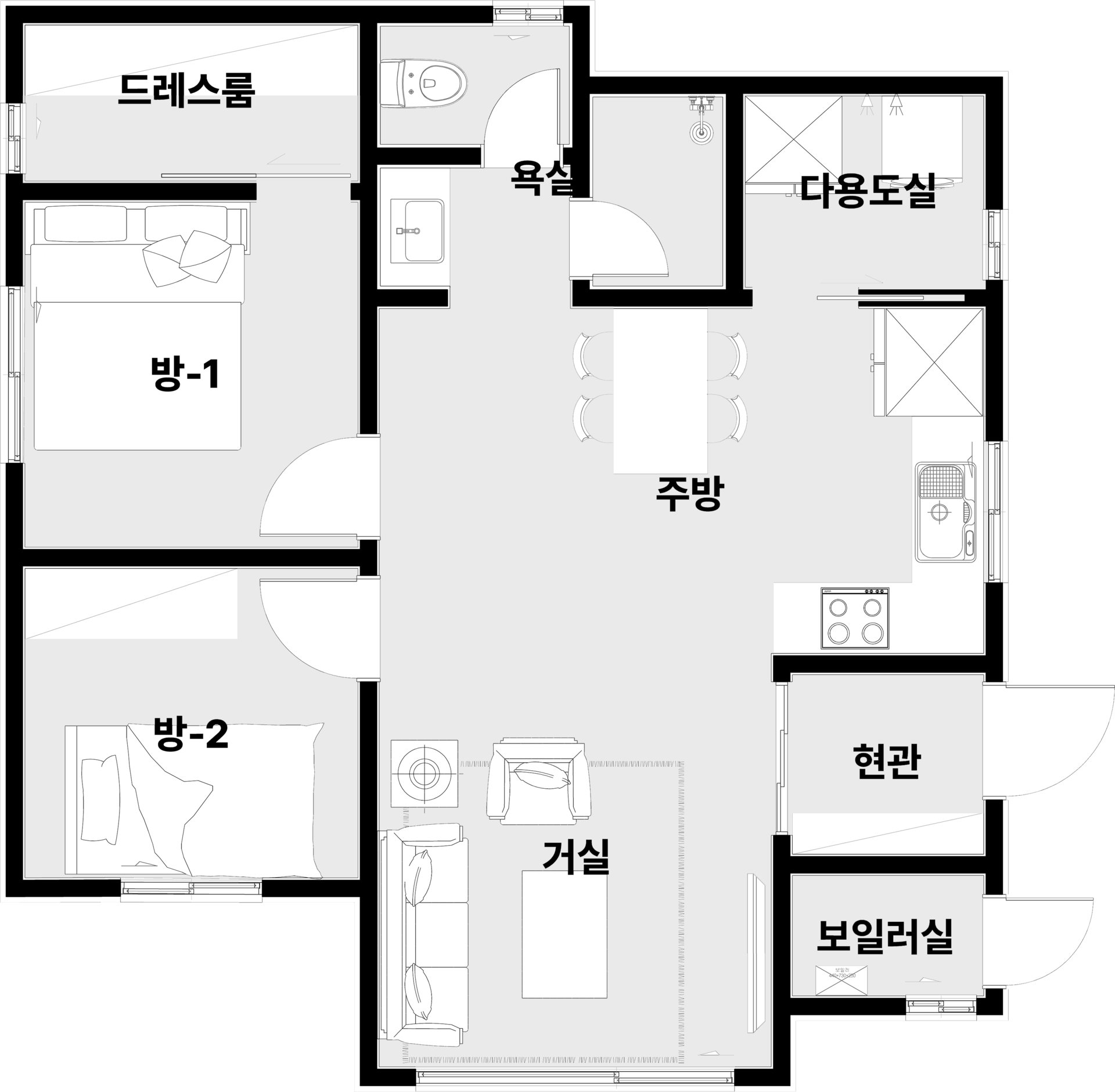 현관, 거실, 주방, 다용도실| 방 2, 화장실 1, 드레스룸, 보일러실