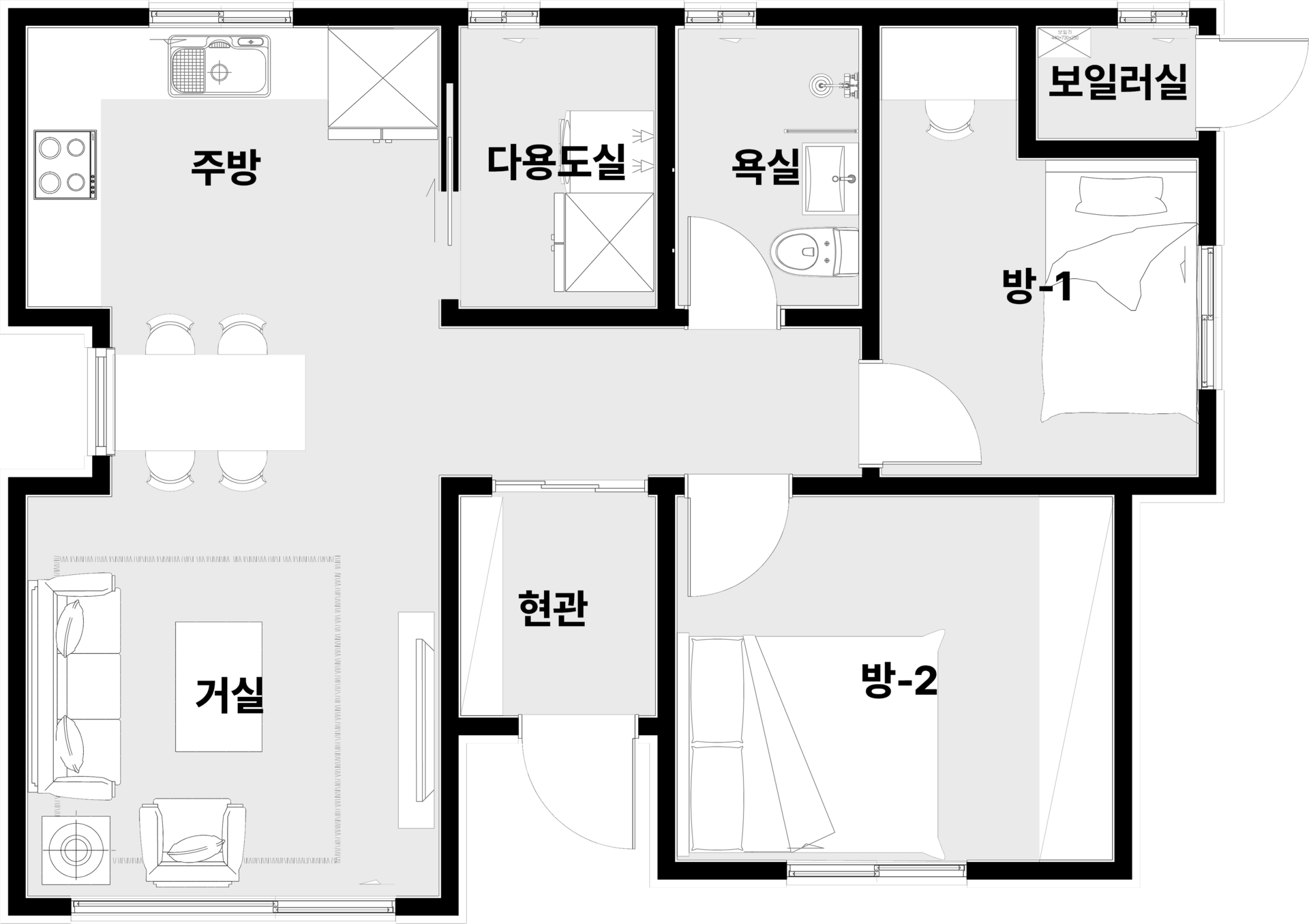 20평에 딱 맞는 방 2개 구성의 설계안으로, 효율적으로 사용할 수 있습니다.