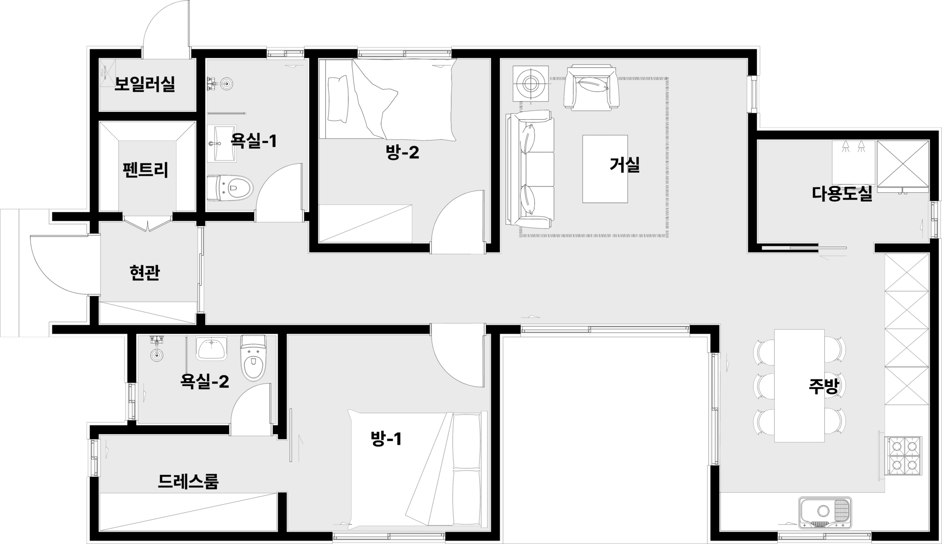 현관, 거실, 주방, 다용도실| 방 2, 화장실 2, 드레스룸, 펜트리, 보일러실