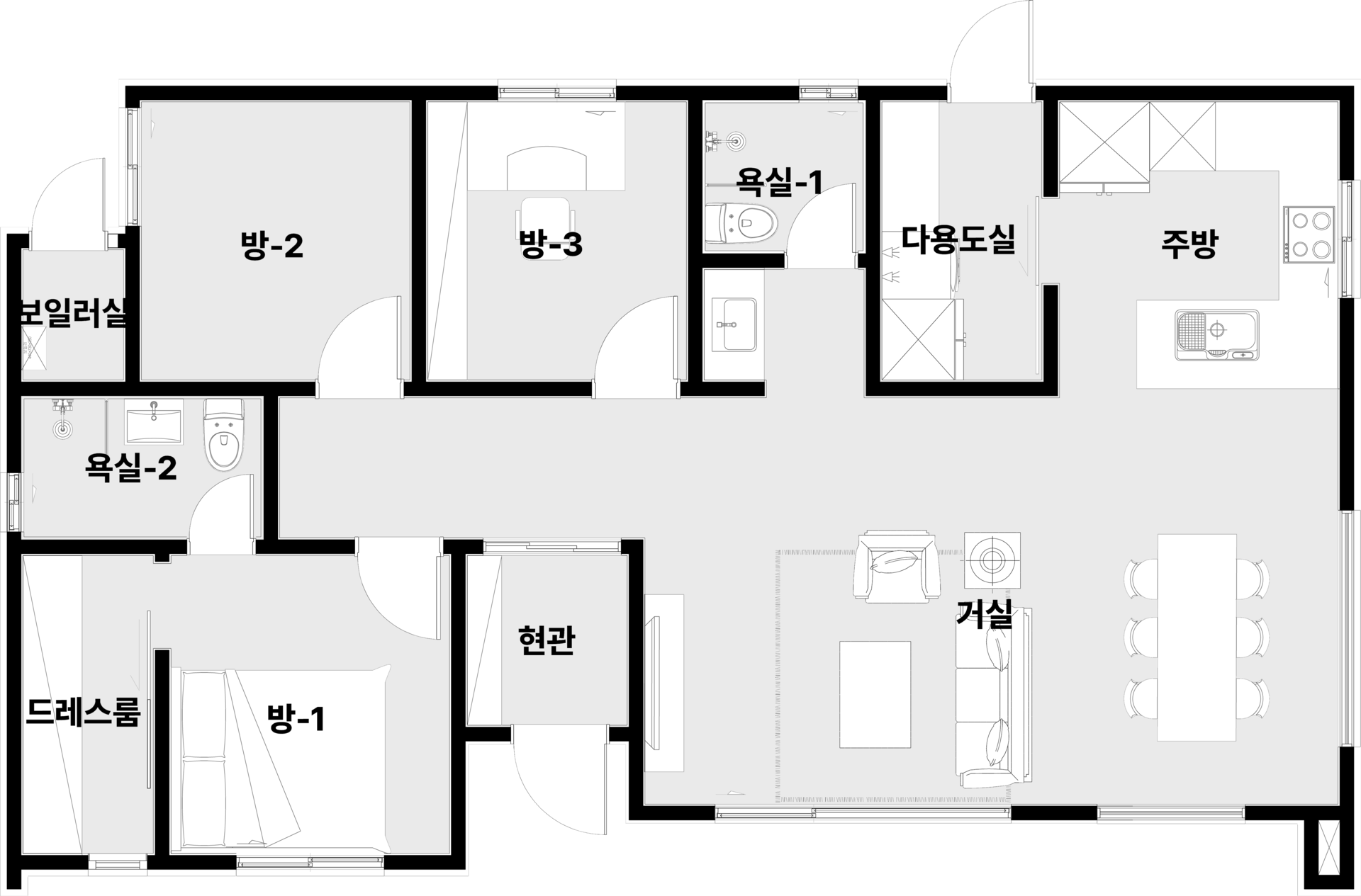 방 3개와 드레스룸이 알차게 배치된 공간으로 공간을 효율적으로 사용할 수 있습니다.