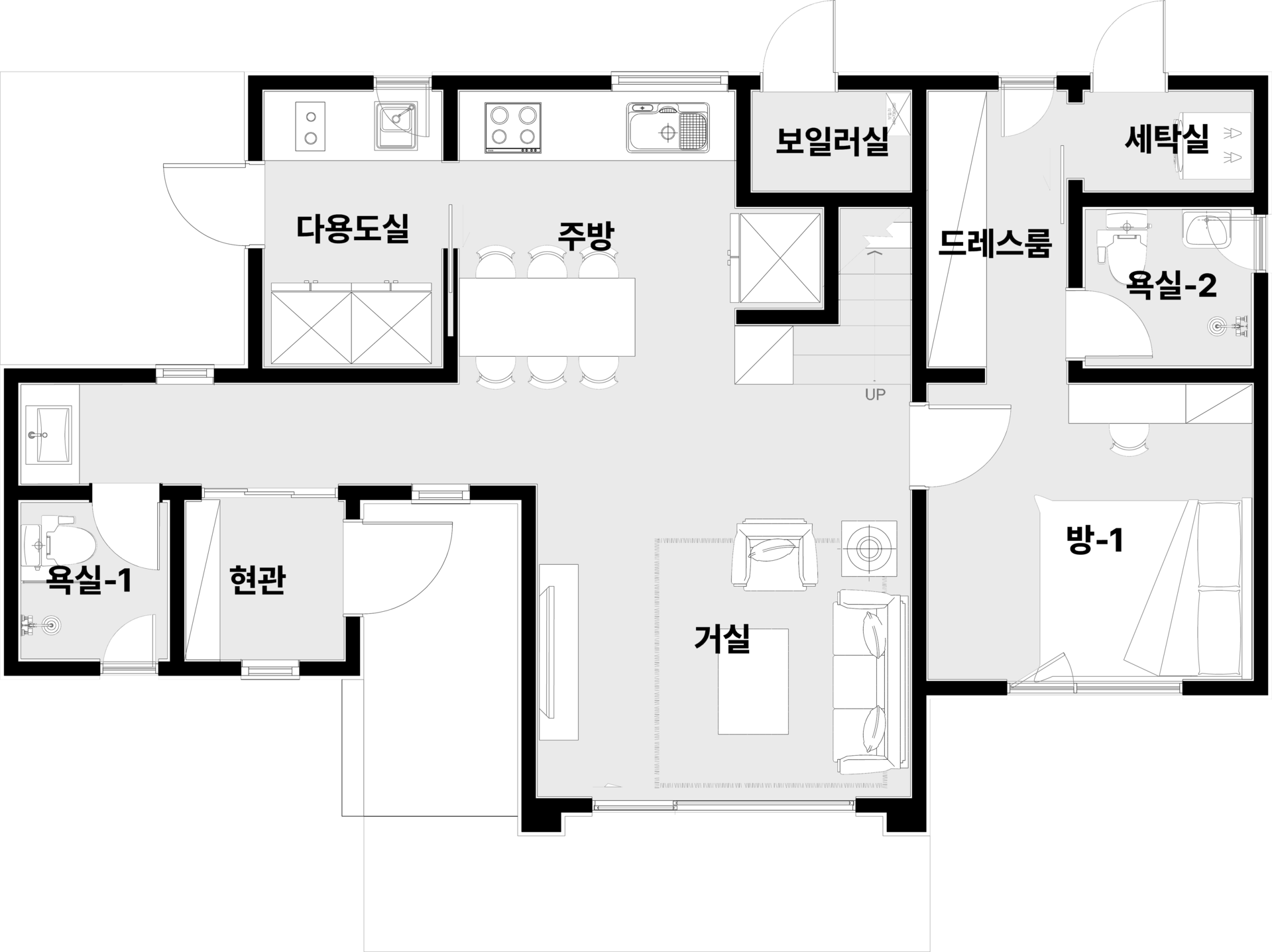 주방-다용도실-데크 / 현관-욕실 / 세탁실-드레스룸 등 모든 동선을 효율적으로 사용할 수 있도록 설계한 설계안을 소개합니다.
