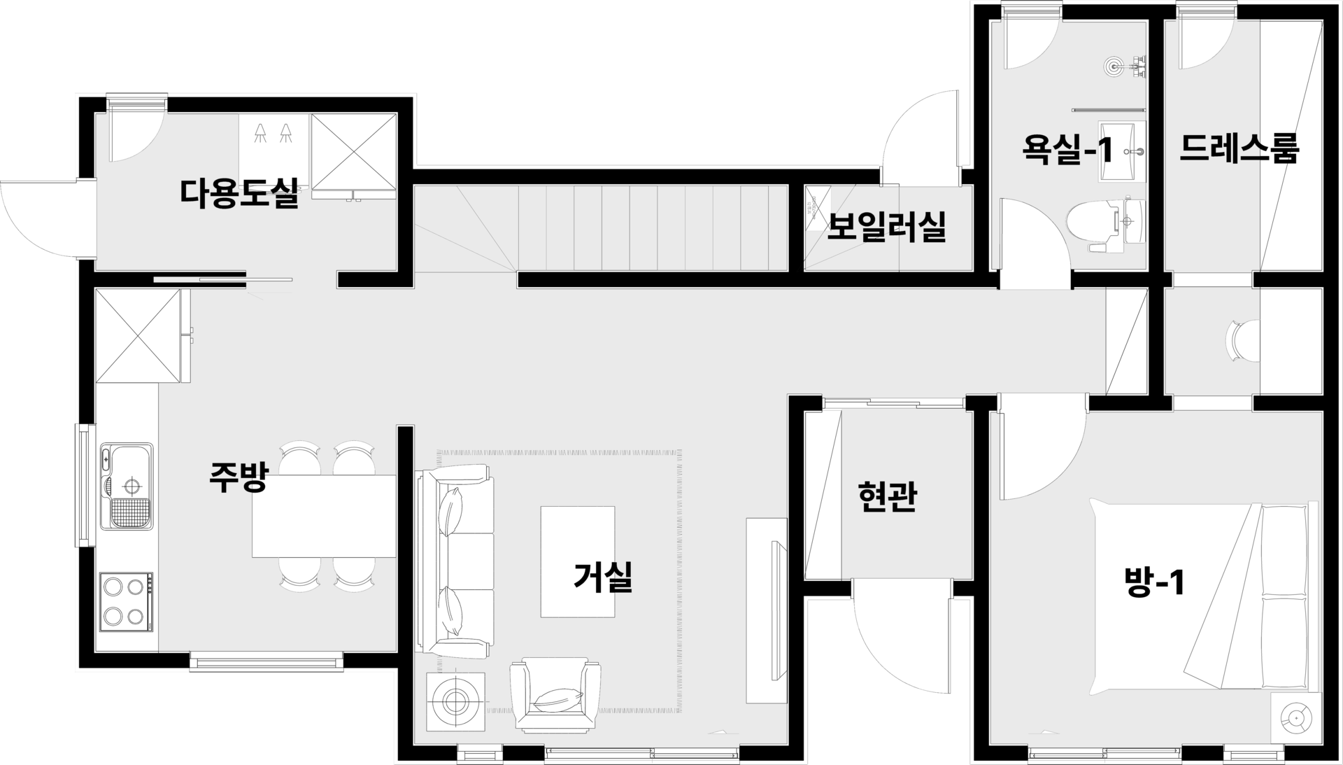 현관, 거실, 주방, 다용도실| 방 2, 화장실 2, 드레스룸, 파우더룸 가족실, 보일러실, 테라스