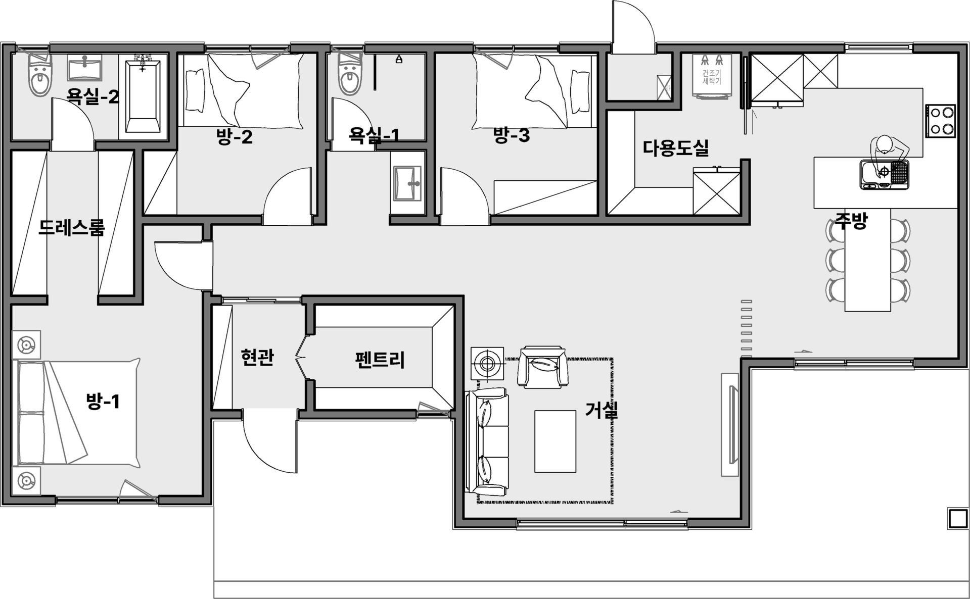 3015주방-다용도실-데크 / 현관-욕실 / 세탁실-드레스룸 등 모든 동선을 효율적으로 사용할 수 있도록 설계된 설계안