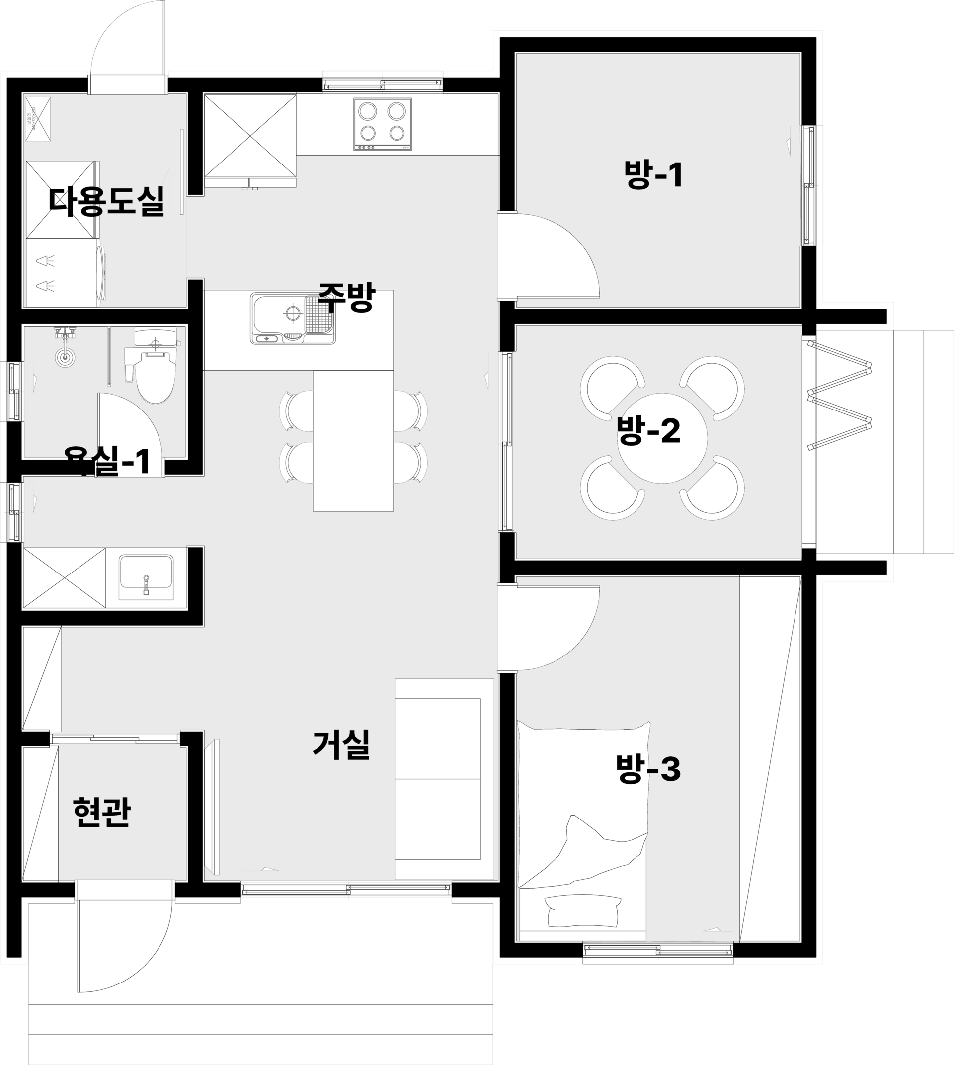 현관, 거실, 주방, 다용도실| 방 3(썬룸변경가능), 화장실 1